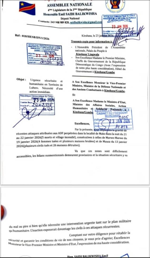 Beni, le 26 Janvier 2026(BENINIPASHE)-– En vacances parlementaires, le député national élu de Beni, Saidi Balikwisha Émil, alerte le gouvernement sur la détérioration persistante de la situation sécuritaire en territoire de Lubero, où les rebelles ADF intensifient leurs attaques contre les civils.